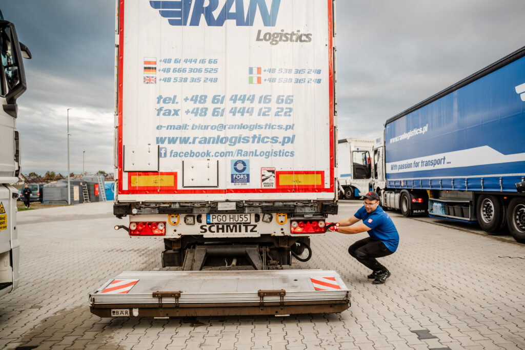 Flagowa naczepa RAN Logistics. Naczepa z windą to specjalistyczna naczepa wyposażona w hydrauliczną platformę, która umożliwia łatwy załadunek i rozładunek towarów bez potrzeby korzystania z dodatkowego sprzętu załadunkowego.