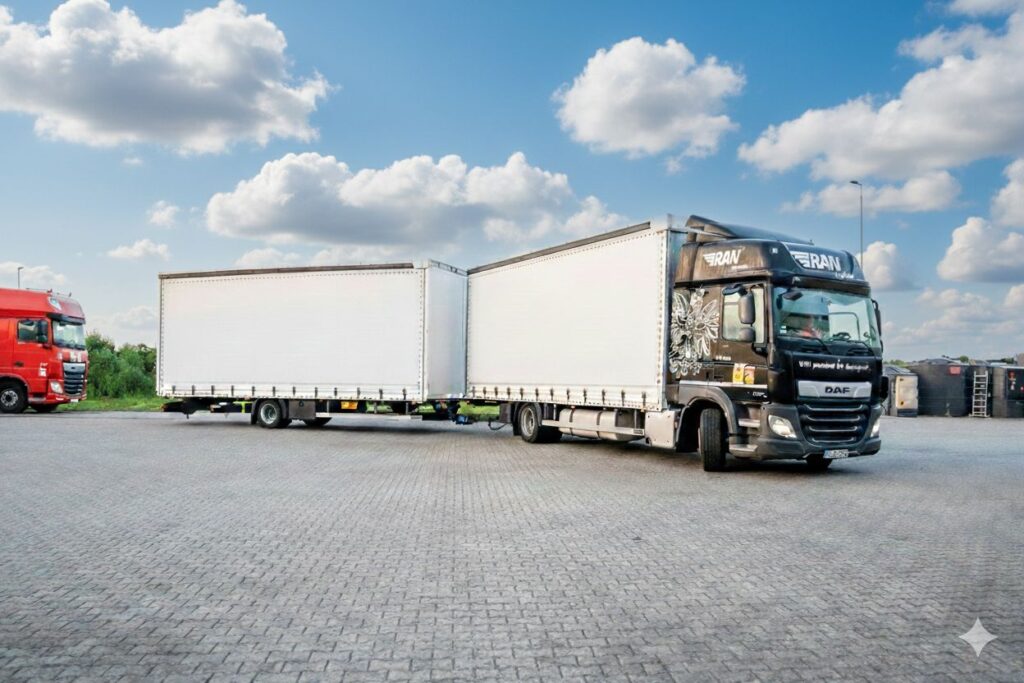 Pojazd typu tandem 7,7m + 7,7m to zestaw transportowy składający się z samochodu ciężarowego i przyczepy, z których każdy ma długość około 7,7 metra a wysokość wynosi 3 metry.